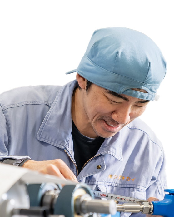 ヨシダキカイが多くのお客さまより選ばれている理由のひとつに、フットワークの軽さがあります。当社は基本的に、お客さまの商品や作業環境にあわせてフルオーダー、セミオーダーで製品をつくるため、あらゆる要望へお応えできる体制はもちろん、突発的な修理依頼などにも柔軟に対応しています。例えば、遠方のお客さまより当日朝にお問合せがあった場合。数時間後には工場を出発し、その日中に作業を完了するなど、製造部内で段取りを調整して、お客さまの生産体制に極力影響が出ないよう優先してすすめています。出張は、修理や組み立てが2~3ヶ月に1回、納品が3~4ヶ月に1回ほど。5人ほどで出向き、一気に作業を行います。今はまだ先輩が担当している案件に関わるという立場ですが、近いうちに自分の担当案件をもつことが今の目標です。高い視点から全体を見ることで、今とはまた違ったものづくりの面白さも感じられるはず。まずは、コツコツ前進あるのみ。前向きに頑張れる環境で、腕を磨き続けたいです。